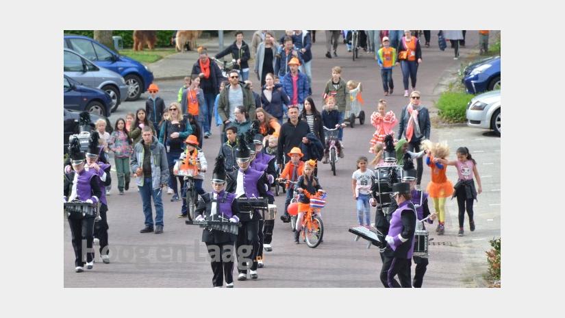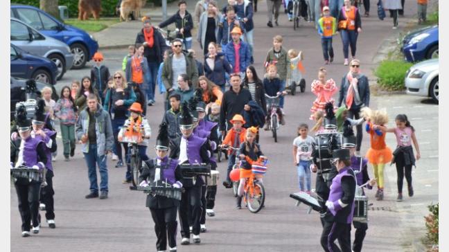 Koningsdag Oosterbeek:Onder begeleiding van twee dames ‘met lange benen’ op weg naar Sportpark ‘Hartenstein’.