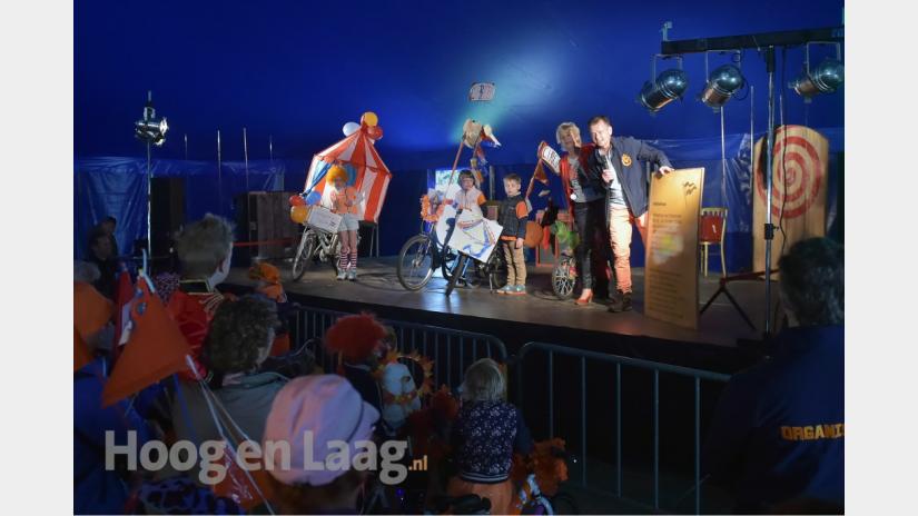 Koningsdag Oosterbeek:Bekendmaking prijswinnaars mooiste fiets door burgemeester Agnes Schaap en Wilfried ter Woerds, voorzitter Oranjevereniging Oosterbeek.