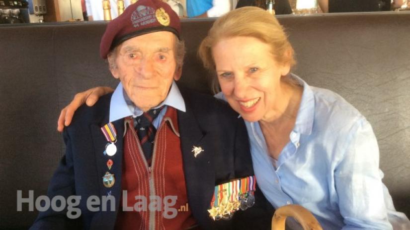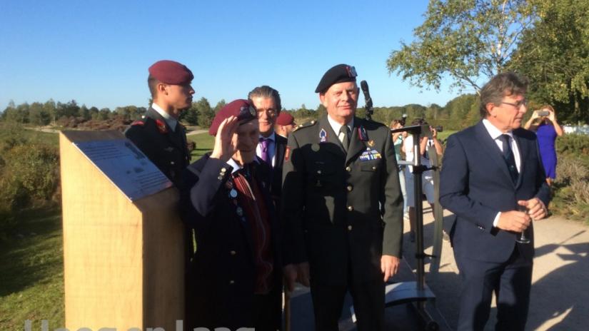 De beleefde Tom Hicks (100) neemt uitgebreid de tijd voor de verzoeken. De veteraan is zojuist toegesproken door generaal-majoor Gijs van Keulen en heeft een plaquette onthuld. Deze wordt later geplaatst op de plek waar hij op 17 september 1944 met zijn parachute landde.
