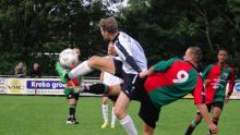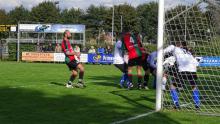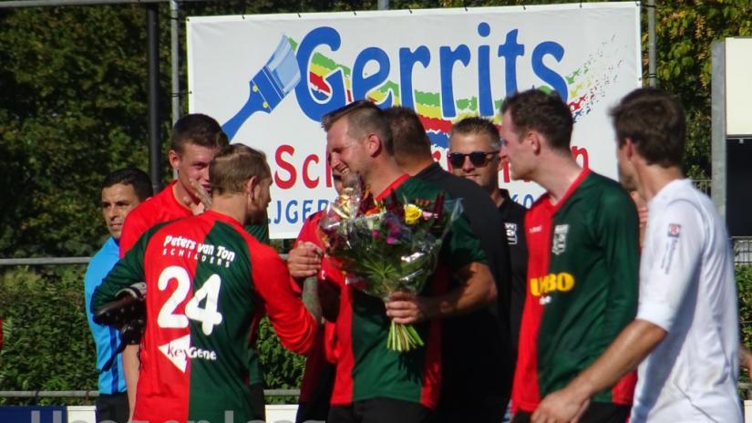 SLOTACT De slotact was weer voor Duraku die Mortier qua doelpuntenproductie zelfs nog voorbijstreefde. Bij de 6-0 was Mortier de aangever. Hij stelde na een subtiele voetbeweging zijn collega ook in staat om een hattrick te maken. Maar die deed er even later nog een schepje bovenop door een voorzet van invaller Roy de Ruiter op de juiste waarde te schatten (7-0). Na het laatste fluitsignaal waren 'de jubileumbloemen' voor Mortier en de wedstrijdbal voor viervoudig doelpuntenmaker Duraku.
