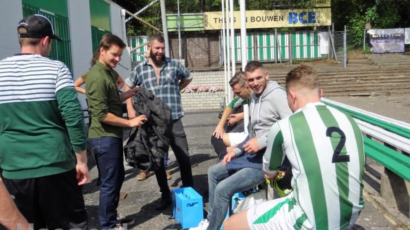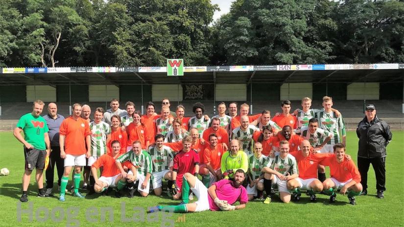 GROEN-WIT Ondertussen druppelden steeds meer familie en oud-ploeggenoten binnen, die stuk voor stuk konden rekenen op een warme omhelzing, die ook de selectie van WVV Wageningen, die al compleet in tenue vanuit Sportpark De Zoom naar het FC Wageningen-stadion waren gekomen en op die manier ook het groen-wit letterlijk weer terugbrachten, daar waar het in het verleden praktisch wekelijks zo zichtbaar en kenmerkend was. Maar dat was toen, nu was het tijd voor toch weer een legendarisch duel.