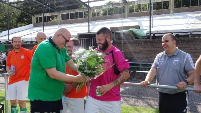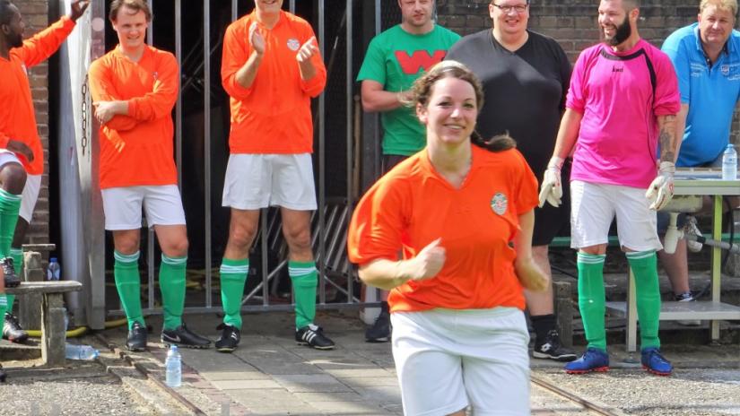 TEAM ROY Team Roy en WVV Wageningen werden door een heuse speaker aan het publiek voorgesteld en betraden vervolgens vanuit 'de spelerstunnel' de legendarische en weer in oude glorie herstelde grasmat, die tegenwoordig ook steeds meer weer gaat lijken op een echt voetbalstadion, compleet met een prachtige rij reclameborden aan het dak van de overdekte staantribune. Na het voorstellen en de teamfoto's werd het tijd voor 'actie'. Rijsemus in het roze gehuld verdedigde voor rust het doel van zijn eigen team, dat mede door het 'ouderwets luidruchtig' coachen van 'hun' doelman, verdedigend niet in de problemen kwam, maar weigerde de kansen op een zeker lijkende voorsprong, af te maken.