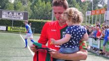 FIETS Terwijl het duel voor 16.00 uur 'op de rol' stond, was het al snel behoorlijk druk op de Berg. ,,Dat ontlokte menig bezoeker de uitspraken: 'Zo druk is het bij ons eerste al jaren niet meer', of 'Wat is het toch heerlijk als er hier weer 'gewoon' gevoetbald wordt. Verantwoordelijk voor die oneliners was Roy Rijsemus, de doelman die even later gewoon op zijn fiets de Berg beklom, maar al snel overmand werd door warme gevoelens toen hij zijn voetbalvrienden ontwaarde. ,,Ik wist dat er 'een wedstrijdje' voor mij georganiseerd zou worden", aldus de hoofdpersoon. ,,Maar dat het nu al zo druk is verrast mij wel. Natuurlijk was ik vanmorgen al met de wedstrijd bezig. Was al even emotioneel bij de gedachte aan het naderende afscheid en ik zal straks zeker ook nog wel wat traantjes laten."